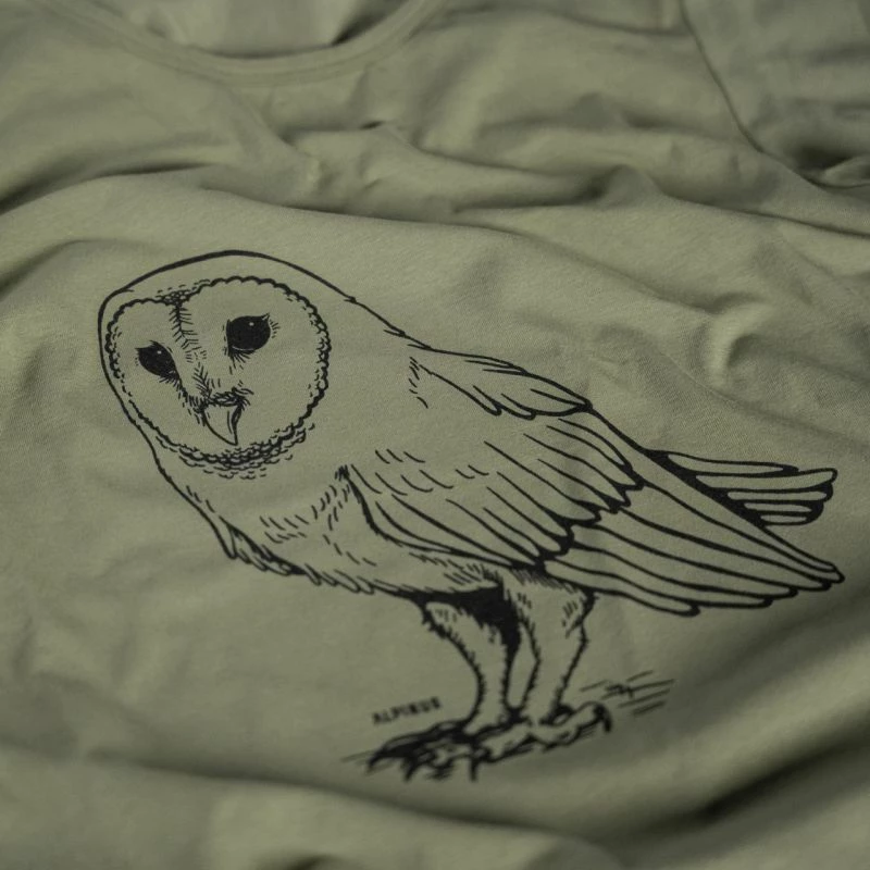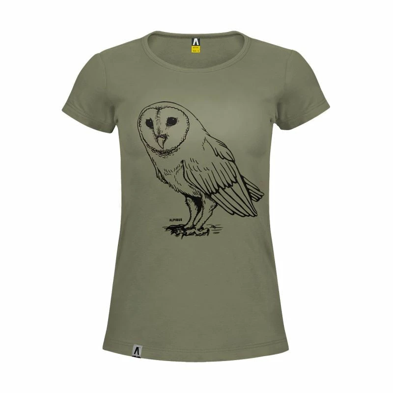 - The olive Dinara T-shirt with the image of a barn owl emphasizes respect for nature and love for animals. The outdoor theme can complement both your travel and everyday wardrobe.