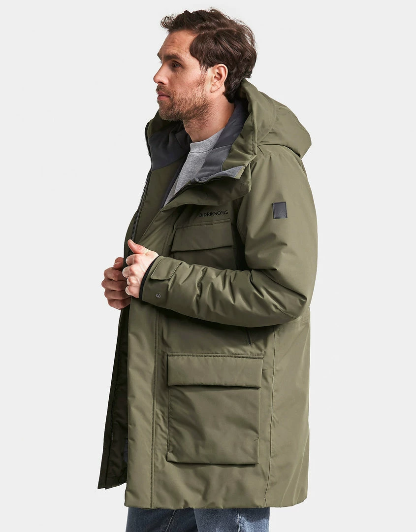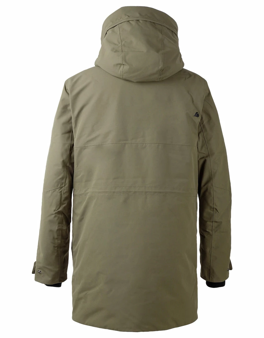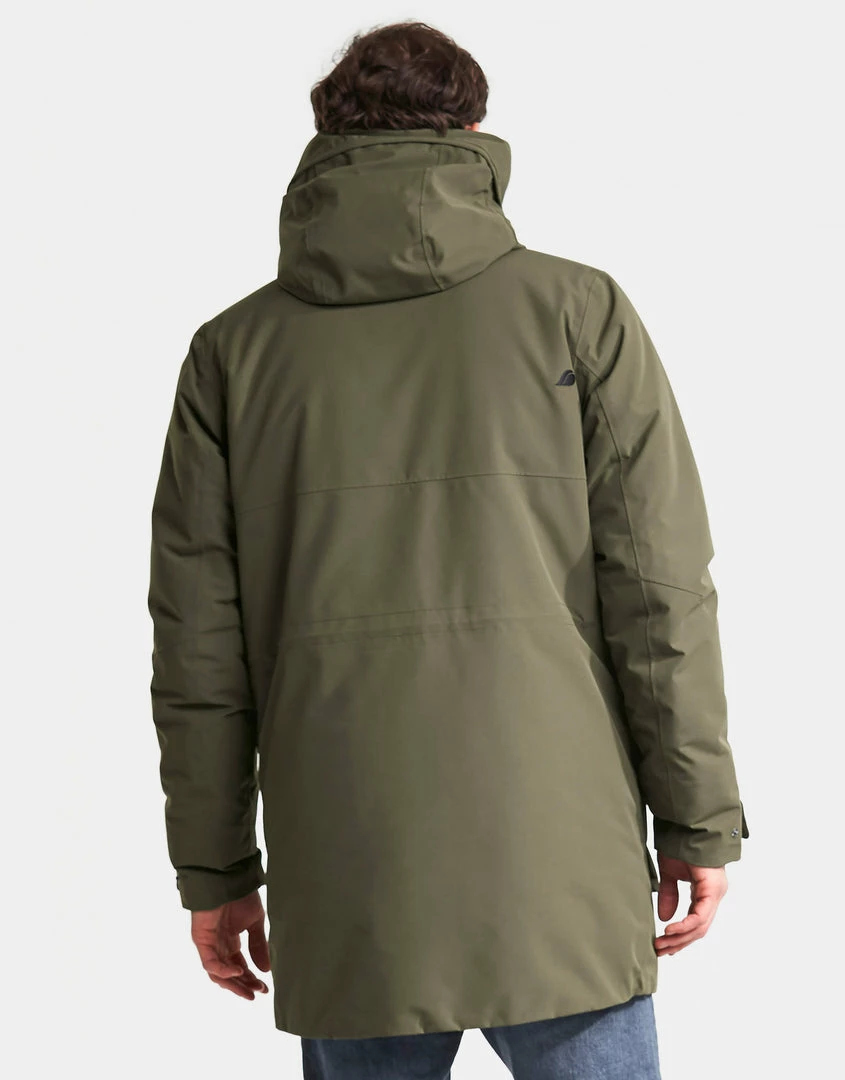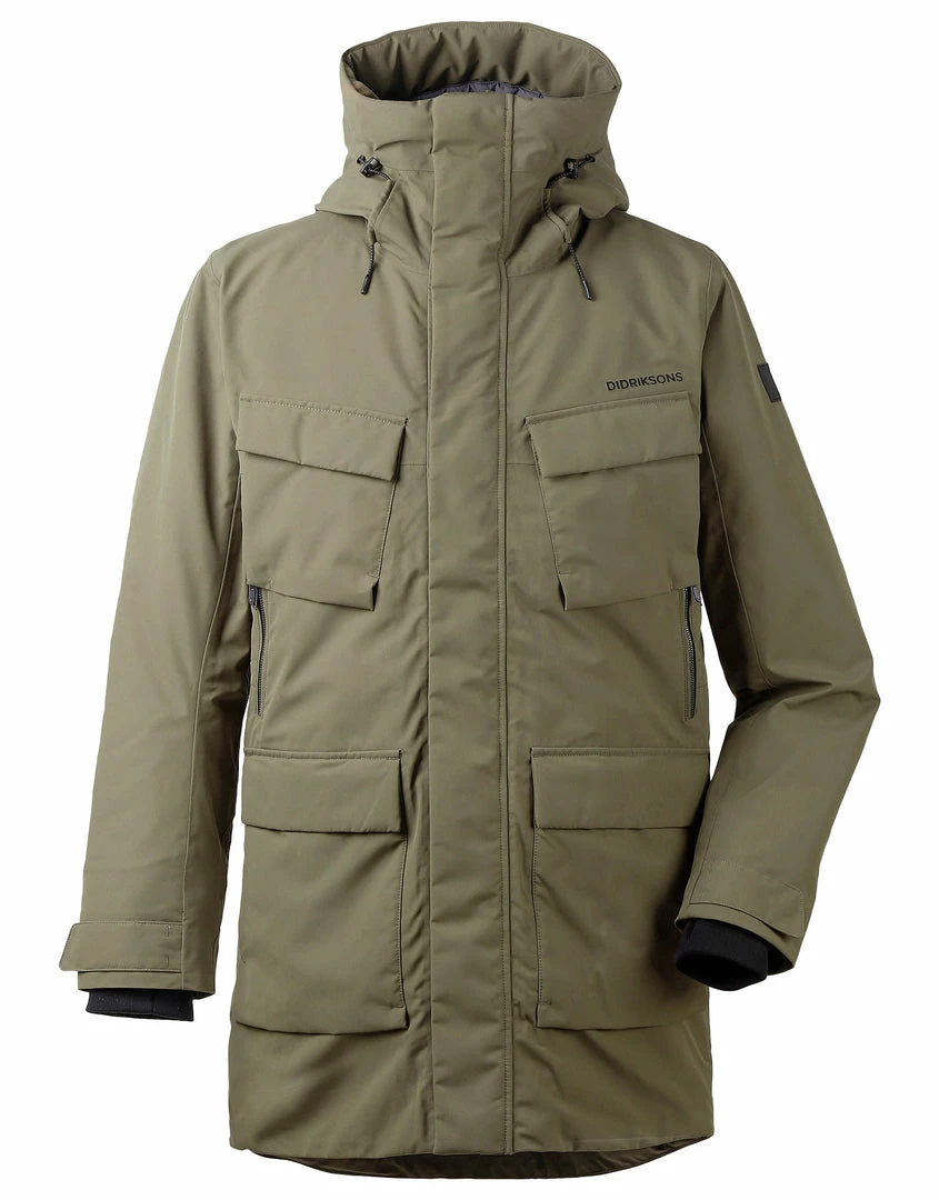 The Mens Drew Parka Jacket from Didriksons is a traditional men’s parka that is wind and waterproof with taped seams and made from breathable fabric. It has six pockets, two with zips. The Mens Didriksons Dale jacket has a fixed hood that is adjustable front and back, and a practical inside pocket. It has a flexible two-way front zip with protective storm flap. The high collar protects against wind and rain. Dale has adjustable drawstrings at the waist and hem for optimum fit. Ribbed cuffs with thumb-holes provide added insulation. Â