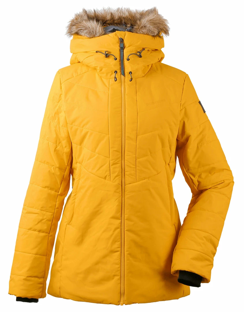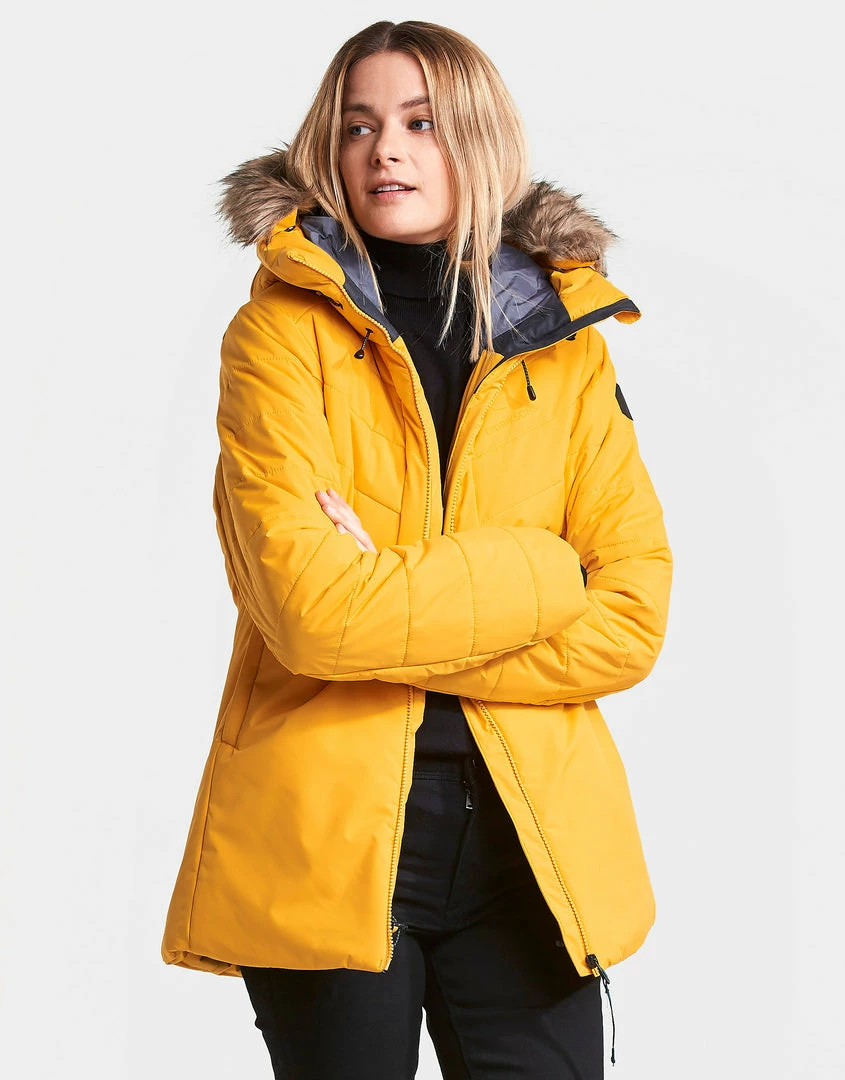 The Womens Nana Padded Jacket from Didriksons is a warm and windproof jacket made from water-repellent fabric. Made from soft polyester with a feminine fit. Two front pockets with zips and one inside pocket. Fixed hood with detachable faux fur trim. Reflective details that are visible when the cuffs are turned up. Inner cuffs with thumb-holes. Â