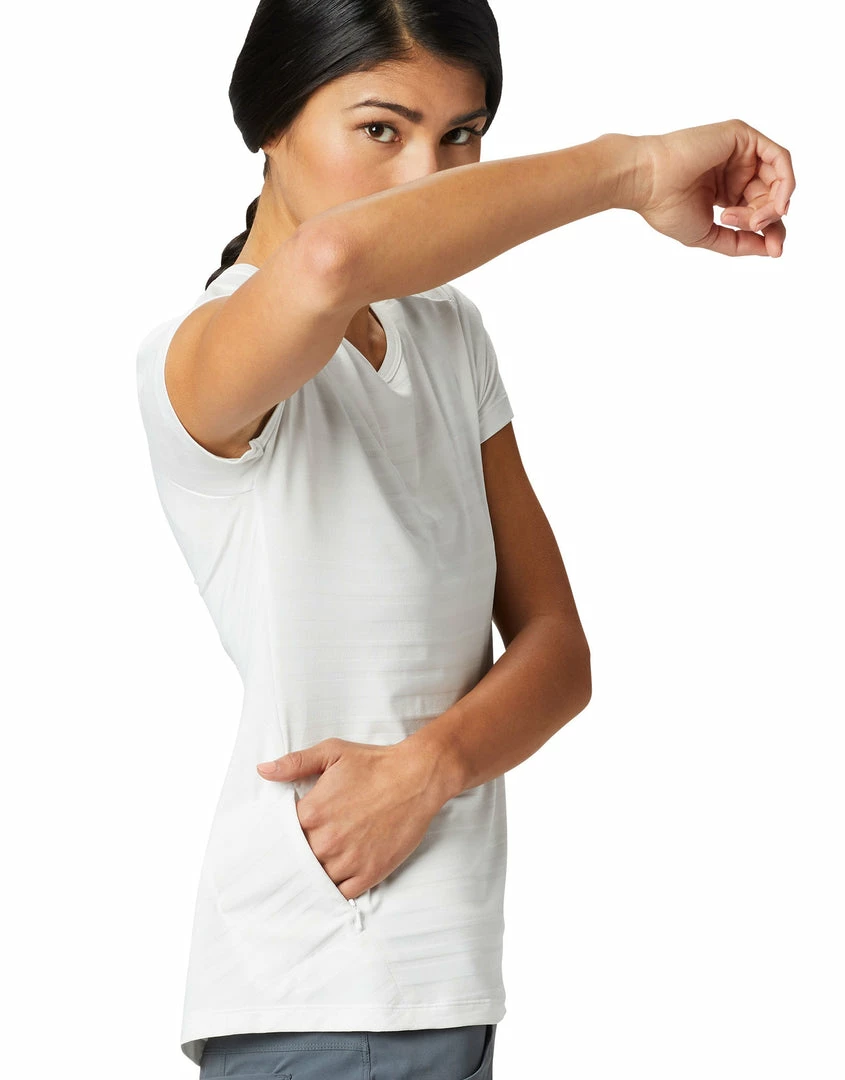 The Mountain Hardwear Womens Mighty Stripe T Shirt is a lightweight, breathable stretch jersey with subtle stripes and a secure zip pocket for holding necessities.