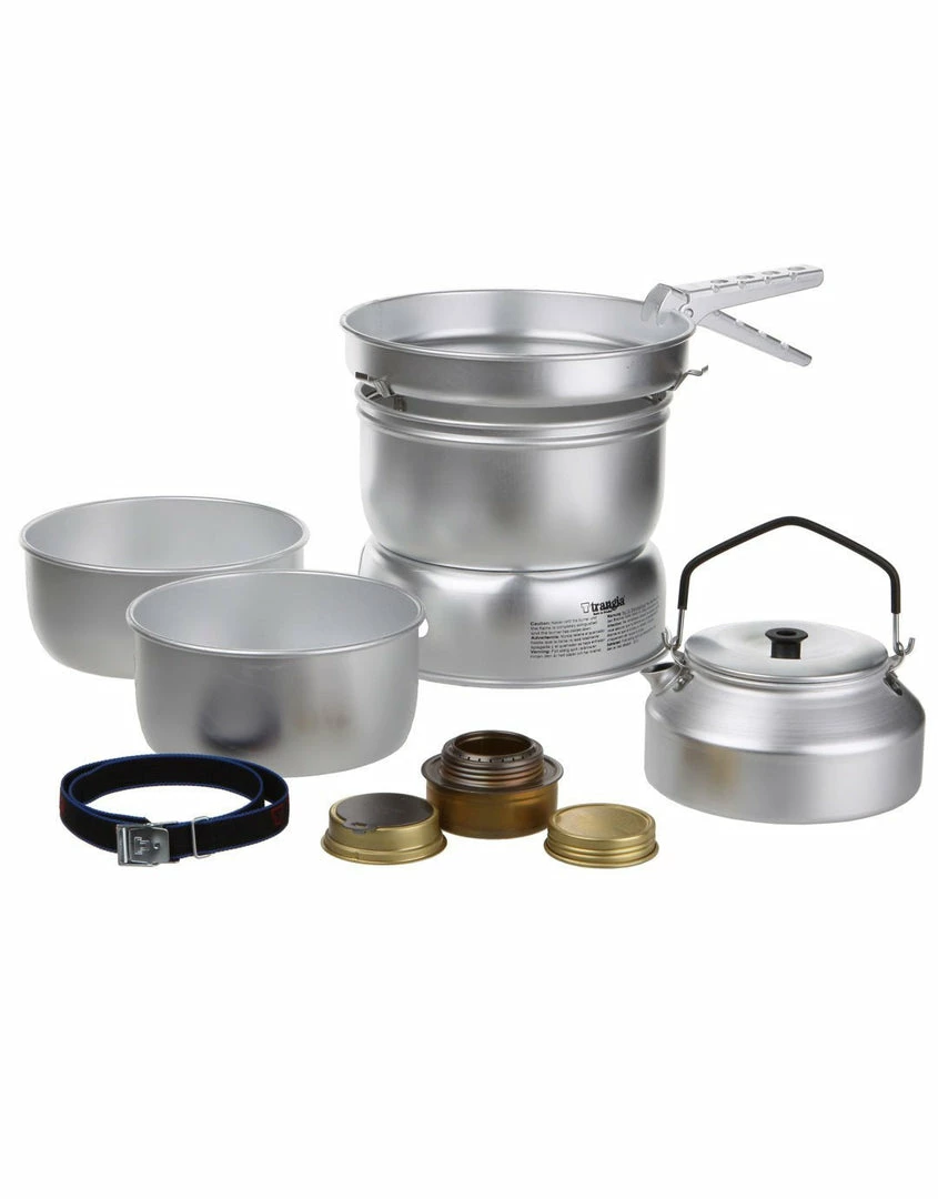 Trangia 27-2UL Cooker with Kettle is a storm-proof, spirit burning, aluminium stove is ideal for 1-2 people and the pans and kettle are smaller than the 25 series to reflect this. The Trangia is a light and reliable camping stove for the outdoors, in all weathers. This camping stove includes two windshields that fit together, a burner, a couple of pans, a combined lid/frypan, kettle and a handle. It is lightweight, needs no special care and is hardwearing. The Trangia stove is reliable, without unnecessary parts that can go wrong or be adversely affected by cold. The stove is quick to set up, and packs into a compact unit that takes up minimal space.